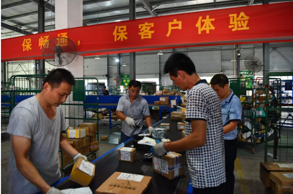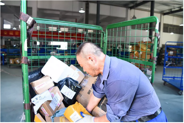 鋼結(jié)構(gòu)的處理中心在烈日的炙烤下像一座巨大的烤箱,十幾個大功率電扇吹出的是一陣陣熱浪,配合著皮帶傳輸機(jī)的轟鳴,讓人多待一會都會覺得難受。為了保證時限,大大小小的包裹都得快速分揀,分揀員們的衣服以肉眼可見的速度被汗水浸透,工作強(qiáng)度非常大。“每天算上加班車,我們要處理13輛郵車的郵件,有時候量多一點會忙到晚上十點后。”轉(zhuǎn)運中心負(fù)責(zé)人程波告訴我們。