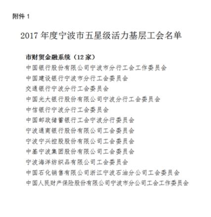 日前,收到寧波市總工會《關于確認2017年度寧波市五星級活力基層工會、示范基層工會的通報》(甬總工〔2018〕59號)的表彰文件,在全市開展的“五星級活力基層工會”評選中,寧波分行工會榜上有名!