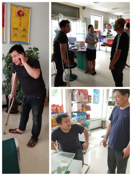 自今年5月份起縣分公司開展4個保險競賽以來,許久靜同志一直放棄周六日休息時間,帶領同事們一起宣傳走訪,邀約客戶,還要對網點每天的出單情況進行督導,非常辛苦。在他和同事們的不懈努力下,作為一個中等規模的網點,婁杖子支局發展期繳保費累計150余萬元。在7月2號的網點保險爆點活動前,他由于搬運大件郵件,不小心從樓梯旁摔倒將腳崴傷,目前走路都成問題,但絲毫沒有影響他完成任務的信心。7月2號網點爆點活動開始,他拄著拐杖出現在工作崗位,對網點爆點活動開展情況繼續進行督導,對自己維護的意向客戶進行邀約,為辦理業務的客戶答疑解惑,時刻關注爆點活動的出單量.....。繁忙的工作讓他的腳又脹又痛,但他強忍疼痛,依舊堅守崗位,同事們看在眼里,既心疼但又感到由衷地敬佩,得到了全體員工的一致贊揚。