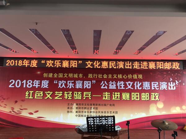 為持續(xù)推進(jìn)幸福郵政建設(shè),豐富郵政員工業(yè)余文化生活,營造輕松活潑、激情奮進(jìn)的工作氛圍,在中秋佳節(jié)和十一國慶節(jié)來臨之際,襄陽市分公司、市郵政工會聯(lián)合襄陽市音樂家協(xié)會民族音樂藝術(shù)團(tuán)共同舉辦《2018年度“歡樂襄陽”文化惠民演出走進(jìn)襄陽郵政》民族音樂會,通過一場高雅藝術(shù)盛會向全市郵政員工致以最誠摯的節(jié)日祝福。