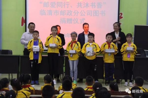 贈(zèng)書儀式開始了,喬校長和臨清市郵政分公司負(fù)責(zé)人分別為孩子們頒發(fā)圖書,拿到書的孩子們,無比的喜悅與感動(dòng),仿佛手里抱著的不是書,而是一份沉甸甸的厚愛與希望。
