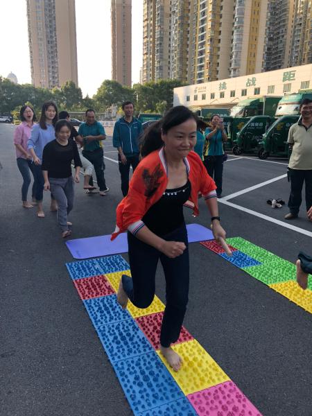 趣味運動會共設計了吹球入碗、共同進步(雙人跳繩)、指壓板接力賽、拔河等四個項目。