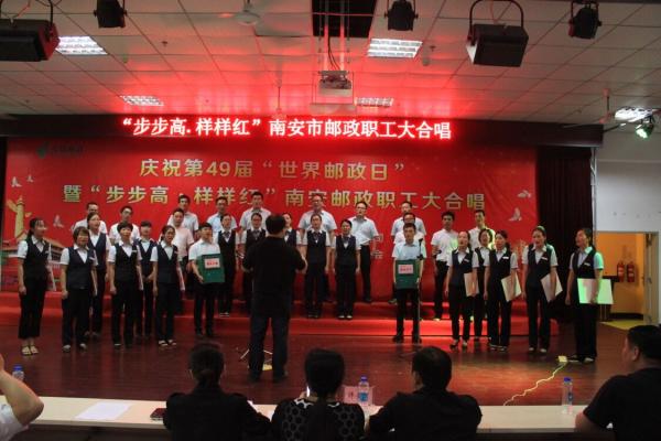 為了鼓舞士氣,弘揚正氣,把全體職工的思想統一到企業改革和發展上來,經過一個多月的籌備,10月10日晚,南安分公司隆重舉行了慶祝第49屆“世界郵政日”暨“步步高·樣樣紅”南安郵政職工大合唱比賽。比賽以《步步高》為大合唱統一歌曲,來自各部門、支局所的21支代表隊紛紛發揮團隊的智慧和力量,在隊形、唱法及服裝上進行創新創意,充分展現屬于自己的風采和特色,各支代表隊隊員身著統一服裝,以整齊的隊列、飽滿的精氣神和高亢激昂的歌聲,謳歌郵政企業的奮斗歷史,展現出南安郵政新時代、新作為的正能量的一面。經過一番激烈的角逐,最終有10支代表隊勝出,分別獲得一、二、三等獎,其中集郵與文化傳媒部獲得本次比賽冠軍。