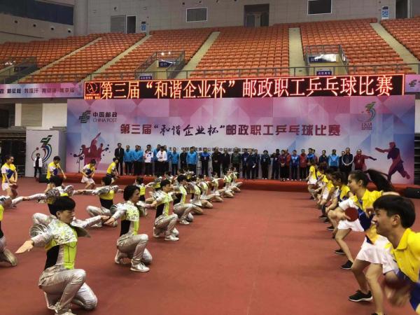 10月23日上午8時整,為深入貫徹黨的十九大報告“廣泛開展全民健身活動,加快推進體育強國建設”的精神,由中國郵政集團公司、中國郵政集團工會聯合主辦的第三屆“和諧企業杯”郵政職工乒乓球比賽在湖北黃石開幕。中國郵政集團公司副總經理、工會主席康寧講話,湖北省郵政分公司總經理任永信致辭、中國郵政集團工會常務副主席李玉峰主持開幕式。全國郵政包括中國香港、中國澳門代表隊在內,共有38支代表隊參賽。