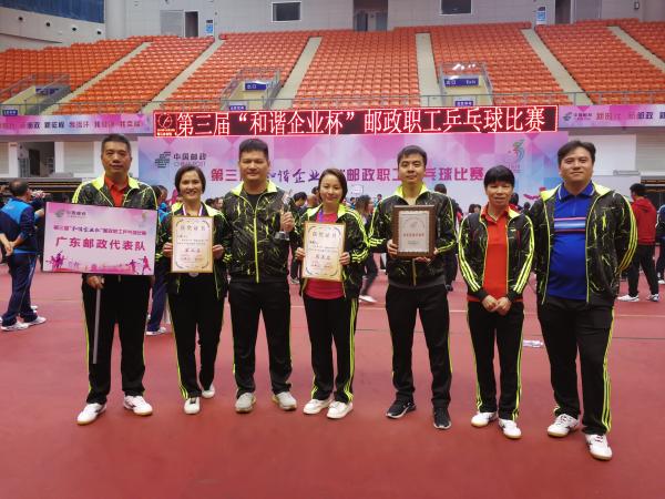 在為期四天的比賽里,來自中國郵政集團各控股子公司、31個省(區、市)郵政分公司、總部機關、直屬單位,以及香港郵政、澳門郵電的38支代表隊共346名運動員進行了男女混合團體、高管單打等9個項目的激烈角逐。我省郵政體協選派了李騰飛(廣州市分公司),唐媛(深圳市分公司),劉青(梅州市分公司),胡永強(東莞市分公司),徐寶玉(廣州郵區中心局),關華昌(信源集團)等6位隊員組成廣東郵政代表隊參加本次的比賽,最終取得了第三屆“和諧企業杯”郵政職工乒乓球比賽道德風尚獎、最具人氣獎、劉青榮獲女子甲組單打第二名、唐媛榮獲女子專業組單打第五名的優異成績,為廣東郵政贏得了榮譽,并得到集團公司領導的肯定和贊許。