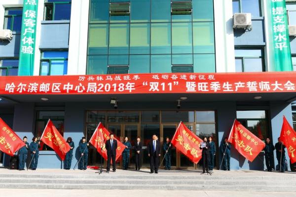 10月25日,中國郵政集團公司哈爾濱郵區中心局召開迎戰2018年“雙11”暨旺季生產誓師大會,全面動員部署“雙11”及旺季生產各項工作。會上,來自該郵區中心局各條戰線的六個代表隊分別做了表態發言,黑龍江省寄遞事業部副總經理、哈爾濱郵區中心局總經理金龍為各個代表隊授“突擊隊”旗幟。