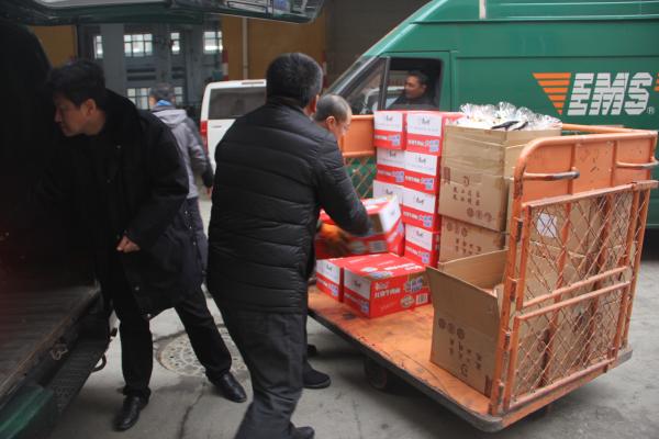 11月15日,正是“雙十一”郵件進出口高峰,早上9:00點,市分公司總經理李剛,副總經理兼工會主席魏亞峰帶領綜合辦公室、工會相關人員來到寄遞事業部和運營管理部(網路運營中心),慰問看望奮戰在這里的郵運和投遞一線的干部員工,給他們送去了方便面、火腿腸、面包、速凍餃子等第一批慰問品。向員工們表達了省公司和市分公司領導的關心與問候。