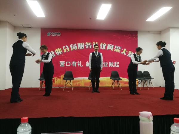 本次大賽圍繞支局日常工作營業場景展開,突出了編排的新穎性和表演的觀賞性。比賽特邀于建明副總經理擔任點評嘉賓,比賽評委由市分公司辦公室、工會、營業分局等部門相關人員擔任,營業分局22個支局120余人參加了本次大賽。在比賽中,參賽選手們集中展示了坐姿、站姿、走姿、鞠躬禮、握手禮、手勢引領、蹲姿、遞接禮、服務十字用語和服務情節展示等服務禮儀規范動作,在細節中體現服務,參賽選手們精神飽滿、動作規范、表演流暢,比賽現場氣氛熱烈。最終學府支局以96.56分的成績摘得桂冠。