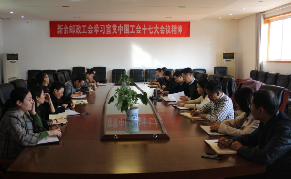 為深入學習宣傳貫徹習近平總書記重要講話精神和中國工會十七大精神,11月30日下午,新余市郵政工會組織召開了學習宣傳貫徹中國工會十七大精神專題會議。新余市郵政工會主席蔡平、副主席鐘麗群及各部門項目主管以上人員、專兼職工會干部、部分職工代表參加了本次學習。