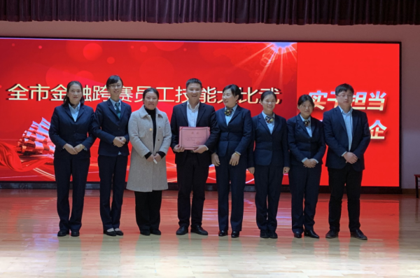 撫州市分公司金融業務部卜燕云經理為榮獲一等獎的資溪縣分公司頒獎并合影留念。