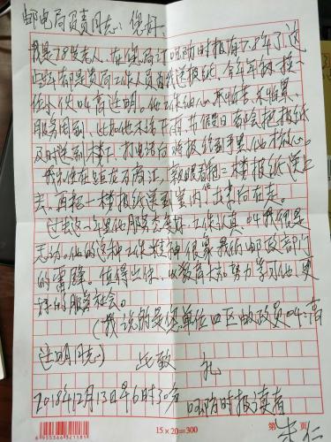 信中寫到老同志朱仁在郵政訂閱報(bào)刊已有七、八年,是《國防時(shí)報(bào)》的讀者,也是郵政忠實(shí)的老客戶。投遞員高廷明負(fù)責(zé)該老人所住片區(qū)的投遞服務(wù)工作,無論刮風(fēng)下雨、風(fēng)吹日曬、或是節(jié)假日,都能看到投遞員高廷明忙碌的身影。信中說到:投遞員每次投遞時(shí)都能親自把報(bào)刊交到老人手上,投遞員認(rèn)真負(fù)責(zé)的工作態(tài)度是我們郵政企業(yè)的雷鋒精神。老人家提出要我們學(xué)習(xí)他的精神,更好的服務(wù)社會。高廷明同志用實(shí)際行動(dòng)詮釋了“人民郵政為人民”的服務(wù)宗旨,用實(shí)際行動(dòng)踐行著郵政人的職責(zé)與使命。
