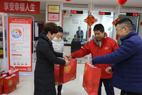 高行長為網點每位員工送上了新年禮包,為基層送去了節日的問候和美好祝愿,并對大家一年來的辛勤工作表示感謝,勉勵大家發揚作風,再接再厲!