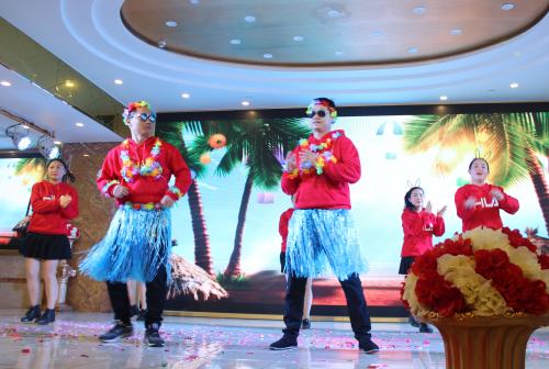 聯(lián)歡會在激情澎湃的開場舞《鼓舞中國》中拉開了帷幕,總經(jīng)理楊海帶領領導班子給大家拜年,向全體員工致以衷心的感謝和新春的祝福。晚會節(jié)目內(nèi)容豐富多樣、精彩紛呈。舞蹈《彩云之南》、獨唱《向往神鷹》、葫蘆絲演奏《清清玉湖水》等充分展現(xiàn)出員工多才多藝的個人風采;三句半《感恩公司》、手語操《我真的很不錯》、表演唱《夜空中最亮的星》等展現(xiàn)了員工對公司滿懷發(fā)展信心的良好精神風貌和團結向上的進取精神;舞蹈《夏日風情》、《黑夜之光》新穎酷炫,充滿創(chuàng)意時尚。由4位公司領導組成的“佩奇F4”組合帶來的搞笑舞蹈《“豬”你快樂》讓大家忍俊不禁,將現(xiàn)場氣氛推向了高潮。