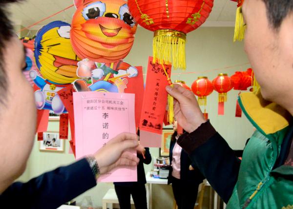 2月18日,北京郵政朝陽區(qū)分公司工會開展了迎元宵趣味猜燈謎活動,活動吸引了眾多職工的積極參與。為了增強元宵佳節(jié)的喜慶氣氛,增進郵政員工的感情溝通, 此次迎元宵趣味猜燈謎活動,工會精心收集了100條燈謎,內(nèi)容涵蓋文化、歷史、地理、藝術、日常生活以及黨建知識、工會知識、郵政工作等內(nèi)容,除了字謎外,還有成語謎、地名謎、人物謎、醫(yī)藥謎等,內(nèi)容豐富,既具娛樂性,又具知識性。 活動開始后,大家踴躍猜謎,認真琢磨,你一言、我一語,互相提示和討論,活動現(xiàn)場歡聲笑語不斷?;顒咏Y(jié)束后,大家高興地說著參與活動的感受“非常喜歡工會搞的這個活動,我已經(jīng)猜對好幾個燈謎了,多年不用的腦筋‘復活’了,感受到了濃重的節(jié)日氛圍,希望企業(yè)多搞些文體活動?!?迎元宵趣味猜燈謎活動為郵政員工營造了溫馨、歡樂、祥和的節(jié)日氛圍,受到大家的一致好評。活動激發(fā)了大家參加工會活動的積極性,為凝聚力量,豐富郵政員工業(yè)余文化生活起到了積極的推動作用。(北京郵政工會)