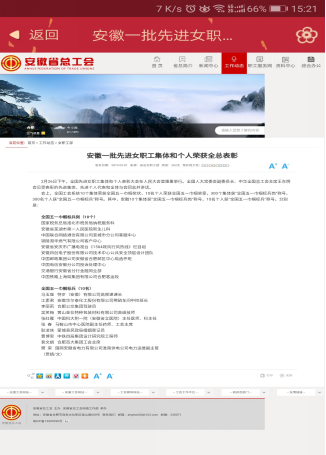 2月26日下午,全國先進女職工集體和個人表彰大會在人民大會堂隆重舉行。會上,全國工會系統10個集體榮獲全國五一巾幗獎狀,10名個人榮獲全國五一巾幗獎章,300個集體獲“全國五一巾幗標兵崗”稱號,300名個人獲“全國五一巾幗標兵”稱號。其中,安徽10個集體獲“全國五一巾幗標兵崗”稱號,10名個人獲“全國五一巾幗標兵”稱號。合肥郵區中心局郵件處理中心函件班榮獲“全國五一巾幗標兵崗”稱號。