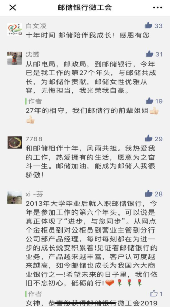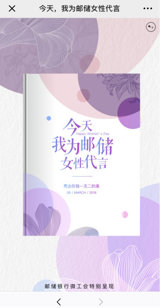 2019年3月8日,為慶?!叭恕眹H婦女節(jié),更好地展現(xiàn)新時(shí)代郵儲銀行女職工精神風(fēng)貌和時(shí)代風(fēng)采,郵儲銀行總行工會(huì)于3月8日當(dāng)天在“郵儲銀行微工會(huì)”微信公眾號上推送“我為郵儲女性代言”線上慶?;顒?dòng)。