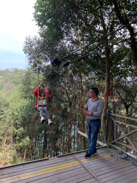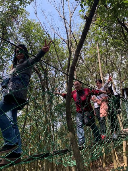 登上彩虹島,漫步彩云梯,走過幻影長廊,星光臺上觀景,走在水云間,女同胞們感受著美麗浪漫的自然風光、色彩繽紛的游樂世界。
