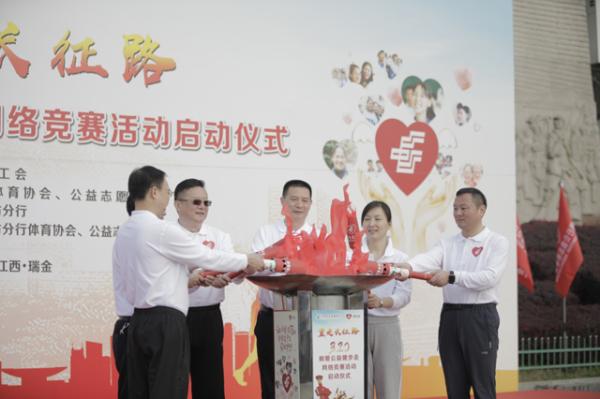 隨后,郵儲銀行工會主席劉敏宣布郵愛公益健步走網絡競賽活動正式啟動,并依次將“郵儲銀行公益志愿者協會”會旗傳遞給江西省分行行長、黨委書記肖天星及公益志愿者代表。而后,由郵儲銀行工會主席劉敏,總行高級資深經理、江西省分行黨委書記、行長肖天星,瑞金市委書記、瑞金經濟開發區黨工委書記許銳,總行工會副主席鄭海英,江西省分行黨委委員、副行長、工會主席劉承亞,瑞金市委副書記、市政府副市長李立東6位領導和嘉賓共同點燃出征火炬,并分別傳遞給6個志愿者方隊(共360人)隊長。隨著三名號手吹響出征軍號,這支“郵愛紅軍”全面開啟從當地歷史博物館出發至紅井景區約3公里的健步走,將“郵愛”腳印深深記印在革命圣地,傳遞到每一個角落,向社會不斷傳遞愛心和正能量。