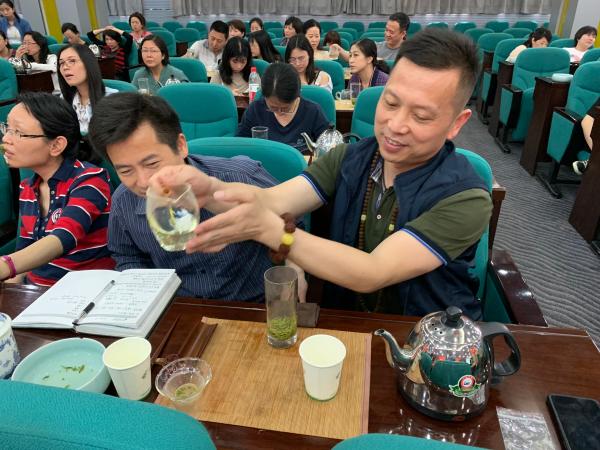 當天上午,首期培訓的主要內容是中國茶文化脈絡、飲茶與健康、中國茶葉分類、綠茶加工工藝、綠茶沖泡方法與實操、綠茶功效與儲存。熊老師一邊示范一邊熱情地為大家講解茶學知識,從“識茶、品茶、茶禮儀、茶與健康、茶與修養等有關茶文化知識進行了細致的講解和示范,及沖泡技術。