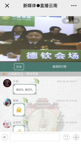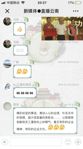 表彰會遠程連線了在迪慶州德欽縣分會場的“全國勞模”尼瑪拉木,她代表云南郵政老勞模向受到表彰的先進集體和先進個人表示祝賀,鼓勵獲獎代表傳承好郵政勞模精神。為了擴大宣傳效應,提高受表彰職工的榮譽感,省郵政工會還精心制作了未能到表彰大會現場接受頒獎的集體、個人風采集錦,在表彰大會與頒發的各獎項同步播放。 網名為“原來”的職工在直播留言區留言:“精彩紛呈的事跡,激動人心的業績,樸實無華的容顏,超大信息量的表彰會……,讓我感受到郵政員工蓬勃向上的朝氣,看見有形的企業精神、有形的企業文化。” 利用手機網絡同步直播表彰大會是省郵政工會針對工會大型表彰活動宣傳方式的一次全新探索,是對互聯網+工會工作的具體嘗試,達到了擴大覆蓋面、提升宣傳效果的目的。