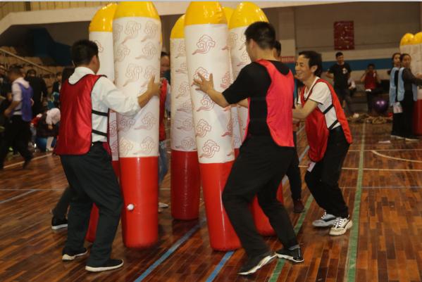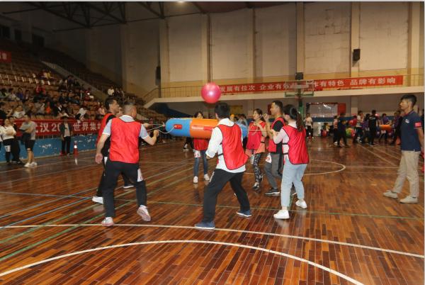 本次活動在大悟縣體育館舉辦,活動特邀武漢戶外拓展團隊指導,確?;顒拥陌踩浴I性。趣味運動會共有八仙過海、不倒森林、陸地龍舟、跨欄健將、雷霆戰鼓、奧運前沖、混合拔河等8項男女混合比賽項目。