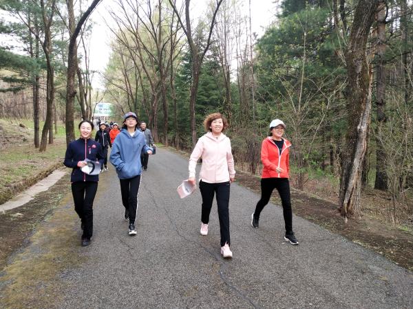 5月10日早上5點30分,伊春郵政分公司和伊春郵儲銀行的員工及公司領導聚集在植物園門前做賽前熱身準備。