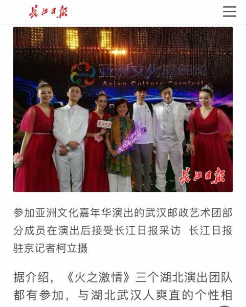 郵政藝術團的優秀表現受到了省內各大媒體的關注和爭相報道。團長龔焰在接受《長江日報》記者采訪時說:“《火之激情》節目因需要與外國藝術家同臺,音樂合成難度很大。有些國外藝術團隊前期排練的音樂與嘉年華演出的音樂有差別,必須重新錄音合成,這個節目與多個外國演出團隊合作,每來一個國家我們都要重新合成一次音樂,工作量是加倍的,對演員來說很具有挑戰性。”