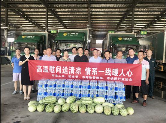 8月2日上午,咸寧市總工會張恩和副主席、團市委李雪梅副書記、市郵政管理局楊正合局長、市快遞行業協會等領導一行,在市分公司辛紅輝副總經理、工會負責人的陪同下,深入岔路口投遞站、網路運行中心開展“關愛快遞小哥 夏日送清涼”慰問活動,為戰斗在高溫一線的投遞員、駕押員、分揀員送上礦泉水、西瓜。