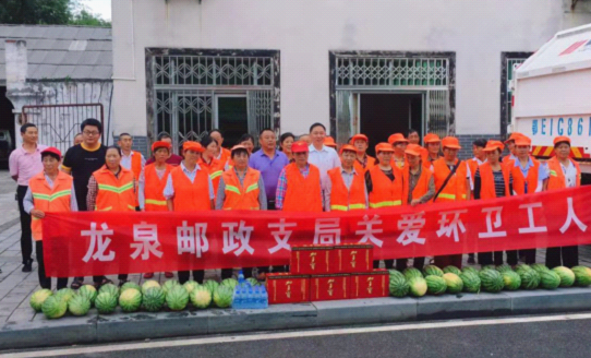 7.31日上午,龍泉郵政局來到當?shù)丨h(huán)衛(wèi)局,給環(huán)衛(wèi)工人們送來涼茶和西瓜等消暑物資,環(huán)衛(wèi)工人對來自龍泉郵政支局的這份關懷表示感謝。