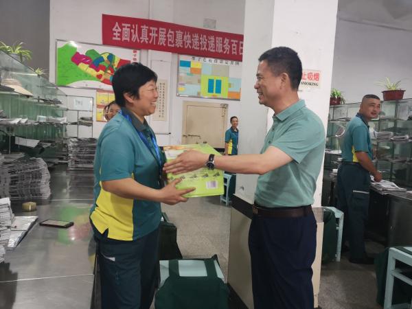 8月2日,安慶市分公司領(lǐng)導(dǎo)班子成員頂著烈日,帶著慰問品,分赴郵區(qū)中心局、5個(gè)城區(qū)營業(yè)部以及部分支局網(wǎng)點(diǎn),為高溫下堅(jiān)持生產(chǎn)作業(yè)的員工們送去了一份清涼。