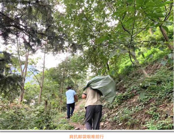 雨后的山路,陡峭而濕滑,每走一步都要格外小心,稍不留神就會摔倒。他們扛著比自己大幾倍的郵袋,小心翼翼地沿著山路緩緩前進。