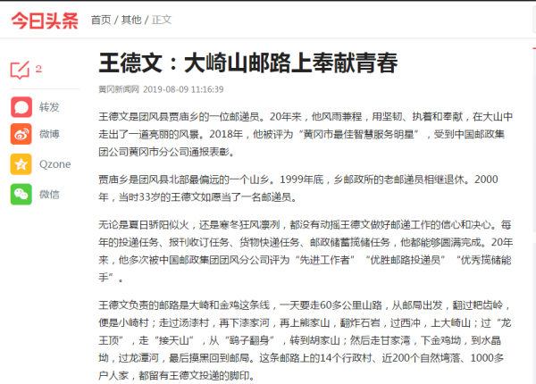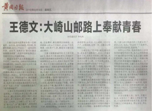 8月9日,《黃岡日報》、黃岡新聞網分別以《王德文:大崎山郵路上奉獻青春》為題,報道了團風縣賈廟郵政支局投遞員王德文的先進事跡,引起了社會廣泛關注。