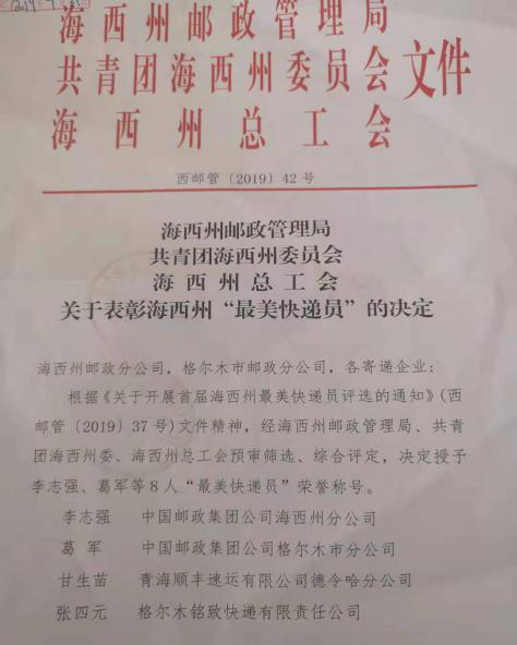 自2019年7月起,青海省郵政管理局在全省快遞行業組織開展了“最美快遞員”評選活動。經全省各市(州)推薦,共產生25位“最美快遞員”候選人,海西州分公司投遞員李志強、格爾木市分公司投遞員葛軍同志成功入圍。經群眾投票,海西州郵政管理局、共青團海西州委員會、海西州總工會預審篩選、綜合評定,李志強、葛軍同志脫穎而出,榮獲海西州“最美快遞員”榮譽稱號。