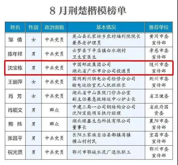 8月24日,“荊楚楷模”8月上榜人物名單揭曉,中國郵政集團公司湖北省廣水市分公司投遞員沈寶棟榜上有名。