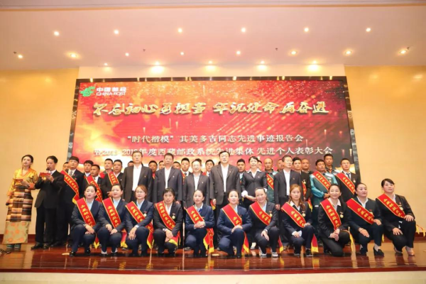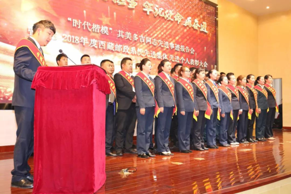 近日,中國郵政集團公司西藏自治區分公司“不忘初心勇擔當 牢記使命再奮進——'時代楷模'其美多吉同志先進事跡報告會暨2015-2018年度西藏郵政系統先進集體 先進個人表彰大會”在拉薩召開。其美多吉同志先進事跡報告團為全區郵政干部員工作事跡報告。通過組織推薦、部門考察、嚴格遴選,最終評選出的11個先進集體和30名先進個人代表接受了表彰。