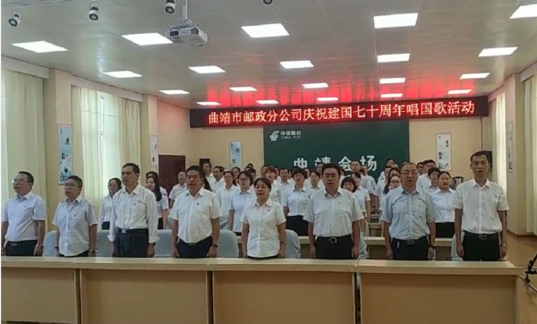 8月23日,曲靖市分公司工會組織開展同唱國歌活動,隆重慶祝祖國建國七十周年。通過同唱國歌活動,激發員工愛國主義熱情,堅持中國共產黨的領導,以習近平新時代中國特色社會主義思想為指引,為祖國繁榮昌盛貢獻郵政力量。