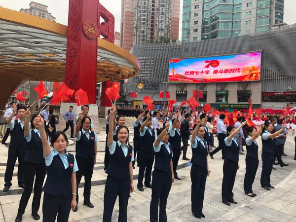 9月19日上午,重慶市九龍坡區分公司作為唯一一家企業,參與“迎國慶70周年.展九龍坡新風貌”系列活動啟動儀式,九龍坡區商圈升級改造的亮相,活動現場揭開了九龍坡區新地標建筑“九龍門”的面紗,隨著“九龍門”身披的紅綢落下,也拉開了九龍坡區慶祝新中國成立70周年系列活動的序幕。活動中,九龍坡郵政組織30名郵政員工在楊家坪步行街參加祝福新中國成立70周年“快閃”拍攝活動,齊聲高唱《我和我的祖國》。用昂揚的精神面貌展示郵政企業形象,深情祝福偉大祖國更加繁榮昌盛。