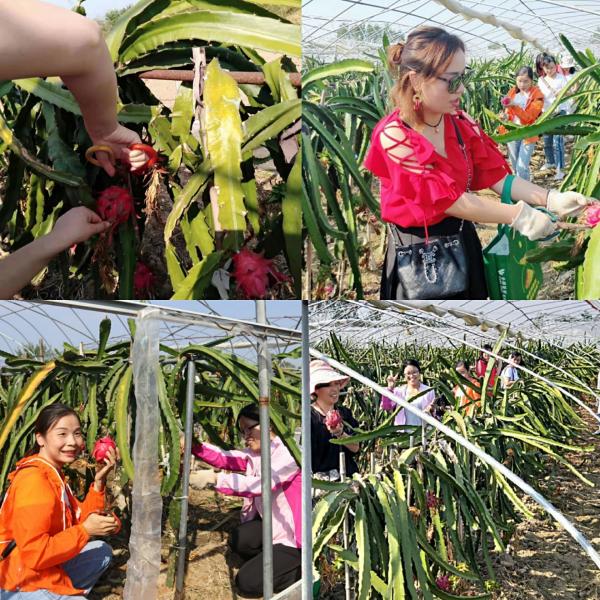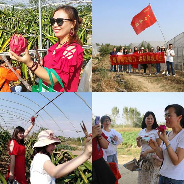 秋高氣爽的季節,秋老虎有恃無恐,照在臉上火辣辣的,大家依然興致勃勃。到了田間地頭,一群成年人竟變成了好奇開心的小學生,連環炮的向農場主發問:“火龍果竟長在這帶刺的植株上,是不是仙人掌科呀?”“什么樣的火龍果才是肉多汁甜呀?”“植株上這么多刺,怎樣采摘不受傷呀?”沒等農場主一一解釋清楚,大家忍不住躍躍欲試了。有的空手赤拳,直接去擰;有的戴上手套,有備而來;有的兩人搭檔,一人頂著果實,一人剪切……大家三個一群,兩個一伙,摘著果實,聊著天,話著家常,拍著照片,發著抖音,忙得不亦樂乎。火龍果植株上的刺刺傷了手,劃傷了臉,沾到了衣服,大家也渾然不覺,回到大自然的懷抱,大家率性的開啟著生命的本真,盡情釋放著工作中的壓力,享受著生活中最簡單最原始最愜意的快樂。