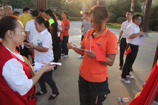 當(dāng)天清晨6:00,活動在大家齊聲共唱《我和我的祖國》中拉開了序幕。隨后,在旗手的引領(lǐng)下,大家迎著初升的第一縷朝陽,列隊進(jìn)入汝水森林公園。