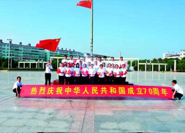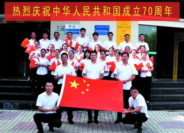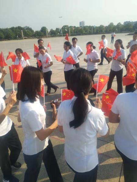當天下午,活動首先在縣分公司大樓門口進行,大家排成兩排,手搖國旗,齊聲共唱《我和我的祖國》。