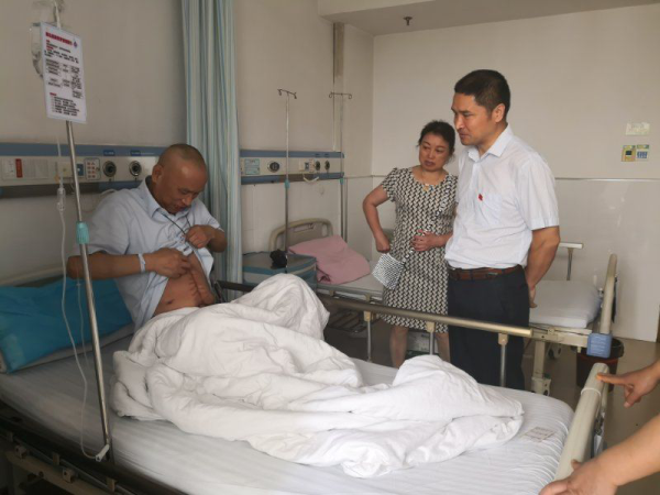 近日,益陽市分行工會主席夏劍、副主席劉志軍、桃江縣工會主席周馥一行來到桃江縣人民醫(yī)院慰問桃江縣支行重病職工許衛(wèi)民。在病房中,夏主席親切的與許衛(wèi)民同志交談,詢問他的病情、治療情況及目前的家庭生活情況,并鼓勵(lì)他一定要積極樂觀,積極配合治療,爭取早日康復(fù)。隨后,向其送上了慰問品及3萬元慰問金。