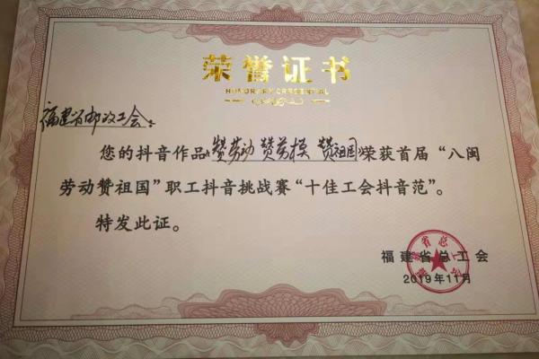 11月17日晚,在省總工會(huì)舉辦的福建省第五屆職工文化節(jié)閉幕式上,省郵政工會(huì)喜獲首屆“八閩勞動(dòng)贊祖國”職工抖音挑戰(zhàn)賽“十佳工會(huì)抖音范”榮譽(yù)稱號(hào)。