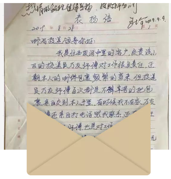 北京市分公司收到一封轉(zhuǎn)自中國郵政集團(tuán)公司的表揚(yáng)信,信中表揚(yáng)了投遞員萬友和劉永勝。工整的字跡、干凈的文面、樸實(shí)的語言,講述著投遞員與用戶之間的點(diǎn)點(diǎn)滴滴。