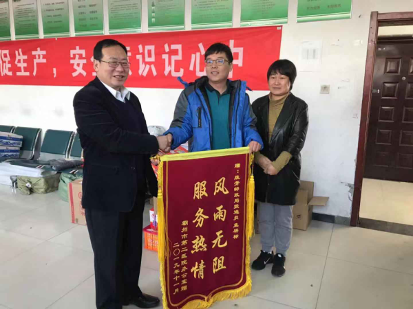 近日,霸州市第二醫院辦公室薛明麗主任代表全院職工,為廊坊分公司直屬勝芳支局投遞員孟祥標送來了“風雨無阻 服務熱情”錦旗。期間,不斷贊揚投遞員孟祥標同事的愛崗敬業精神,六年來,無論風霜雨雪每天都熱情禮貌地堅持給二院送信送包裹,得到霸州市第二醫院全體職工的認可,“平凡的小事每天堅持做下去就是偉大”。