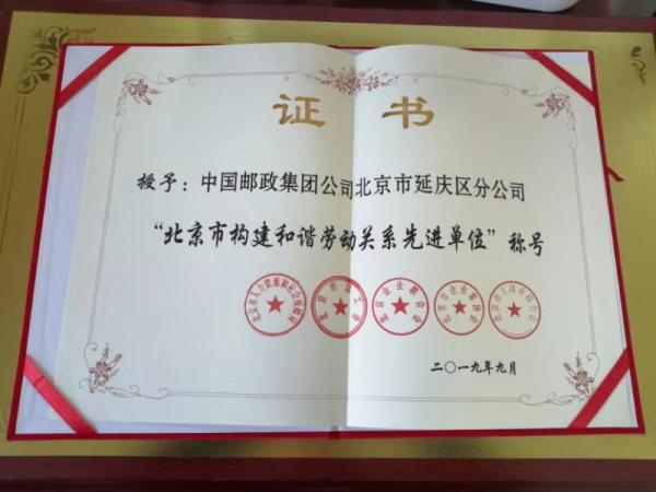北京郵政延慶區分公司積極推進“勞動關系和諧企業”創建工作,在企業實現健康、快速、協調、平穩發展的同時,切實維護員工合法權益,不斷推進民主管理進程,重視協調勞動關系,全心全意為員工服務。近日延慶區分公司被評為“北京市構建和諧勞動關系先進單位”榮譽稱號。(北京郵政工會)