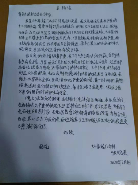 病疫無情人有情。1月31日上午10時25分,承德興隆縣郵政公司大水泉支局接到大水泉鄉(xiāng)廠溝村村民張曉美的求助電話,其父因患有嚴重的十二指腸癌,今天下午4點前必須服用采購的一批特效藥,否則就會有生命危險。而購藥郵件已于1月30日到達興隆縣城,大水泉郵路由興隆至寶地客運車代運,由于疫情形勢嚴峻,全縣所有客運營運車輛全部停運,原本已裝上郵車的郵件只得暫留在縣城運管所集中保管。求助就是命令。大水泉支局長程躍接到電話后,立即向興隆縣分公司領(lǐng)導(dǎo)匯報,縣分公司領(lǐng)導(dǎo)隨即向縣新型冠狀病毒感染肺炎疫情領(lǐng)導(dǎo)小組進行求助,與交通局溝通協(xié)調(diào)放車事宜,并安排網(wǎng)運調(diào)度員通知客運車輛司機在運管所待命,便于在放車的第一時間將藥物緊急運輸?shù)酱笏Ь郑瑫r,安排一輛郵政車輛在運管所待命,如果協(xié)商不成,則專車運輸,大水泉郵政支局做好接車及郵件投遞相關(guān)準備工作。經(jīng)過多次溝通協(xié)調(diào),下午13時35分,代運郵件客車準時到達大水泉支局。郵件一到,女投遞員王麗媛立即騎上摩托車向與客戶約定好的接收地點出發(fā)。當(dāng)時第二場冬雪尚未融化,沿途路面有結(jié)冰現(xiàn)象,十分危險。王麗媛毫無畏懼,因為她的心中只有一個念頭,一定要在下午4點之前讓客戶拿到特效藥。下午15時20分,王麗媛在約定地點將郵件遞交到客戶手中,晚上17時30分,王麗媛接到了張曉美的感謝電話,稱其父用藥后已脫離危險。這是一次與時間賽跑的投遞,這是一次與死神爭取時間的投遞,疫情面前,承德市興隆縣郵政分公司用實際行動堅守初心與使命,堅決履行央企政治責(zé)任、社會責(zé)任。