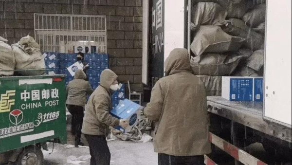 保障防疫物資第一時間運達一線,2月14日,唐山市灤南縣分公司郵件處理中心工作人員冒著風雪裝運防疫物資3000余件。他們說:“要盡自己的微薄之力做好物資運送的‘第一關’,只有我們快點,防疫物資才能更快抵達目的地。”