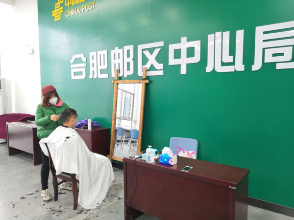合肥郵區(qū)中心局工會在疫情期間為了方便廣大的男員工理發(fā),經(jīng)多方聯(lián)系邀請理發(fā)師上門服務,在本局大會議室一角,臨時搭建理發(fā)臺為員工理發(fā)。