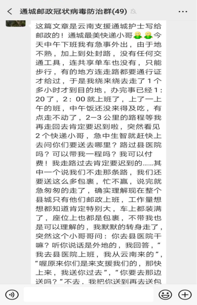 “通城最美快遞小哥,我為他點贊,也為像他一樣默默堅守在平凡工作崗位的小哥們點贊,你們是通城最亮的風景線。”一封由云南省護士雷鳴在朋友圈發表的感謝信溫暖人心。“他明明知道我在醫院上班,天天跟病人在一起,是高危人群,不僅沒有遠離我,還敢拉我,真是個好心人啊!”樸實的文字充分體現醫護人員的辛勤付出和她對通城縣郵政分公司投遞員黎聰的感激之情。