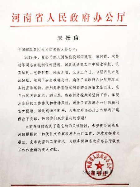 “新型冠狀病毒肺炎疫情發(fā)生以來,熊兒河攬投部閆建雷、宋偉霞、宋英超三位同志講政治、顧大局,在疫情防控期間堅(jiān)持工作,體現(xiàn)出良好的工作作風(fēng)和精神風(fēng)貌,確保了省政府辦公廳的報(bào)刊信件投遞、郵政速遞不斷檔,為省政府辦公廳工作順利開展做出了貢獻(xiàn),特向你們表示衷心的感謝!”2月19日,鄭州市鄭東新區(qū)郵政分公司收到了一封來自河南省人民政府辦公廳的感謝信。